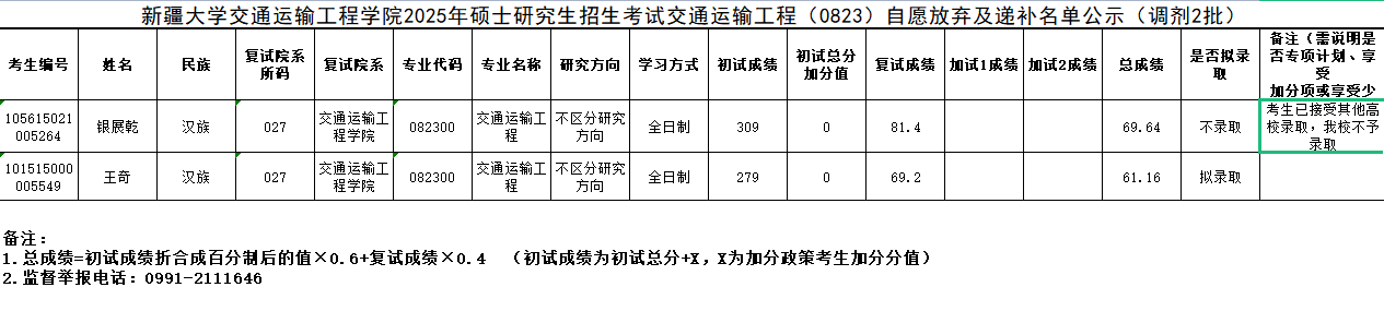 bwin中国官网2025年硕士研究生招生考试交通运输工程(0823)自愿放弃及递补名单公示(调剂2批)