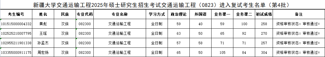 biwn必赢网址交通运输工程2025年硕士研究生招生考试交通运输工程(0823)进入复试考生名单(第4批)