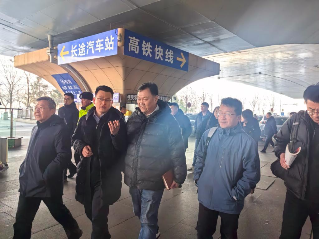 会议伊始,全体参会人员对乌鲁木齐站及其周边交通组织现状展开实地调研。乌鲁木齐站场务服务中心负责人详细介绍了当前车站接驳设施、客流分布及存在的痛点难点问题。邵春福院长一行认真观察现场交通情况,与场务人员进行深入交流,对高铁站周边公交站点布局、出租车及网约车停靠区设置以及人行道设置等问题提出了建议。